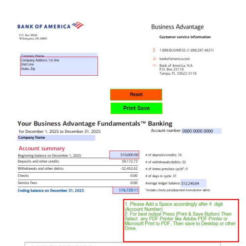 Template Features of 2025 December BOfA Bank Statement (Business Template)