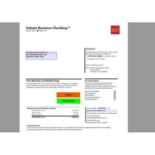 Wells Fargo Bank Statement for July 2025 Business Template PDF